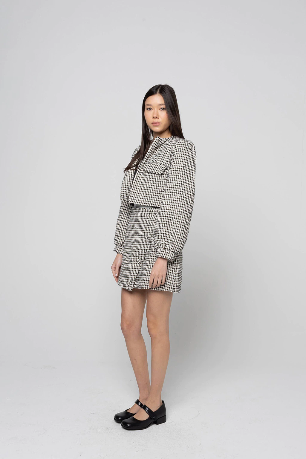 Jaqueta confeccionada em tweed um tecido estruturado, com leve brilho, ombreiras nas mangas, botão no punho.