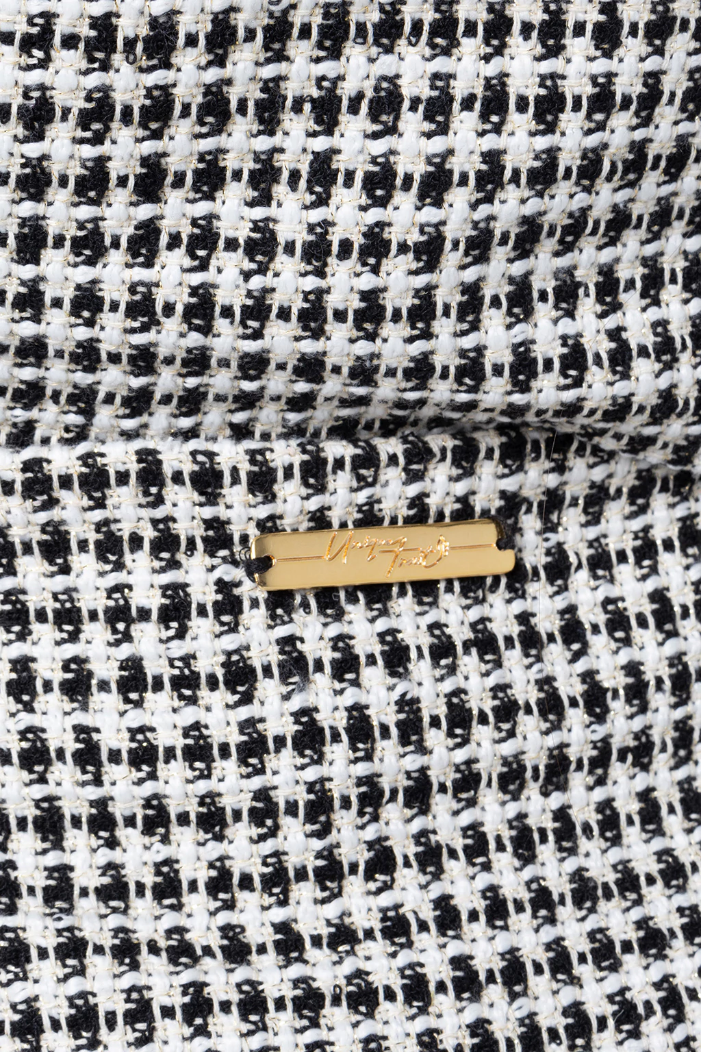 Saia confeccionada em tweed, modelagem assimétrica, peça toda forrada, com 5 botões forrados e abertura na lateral em zíper.